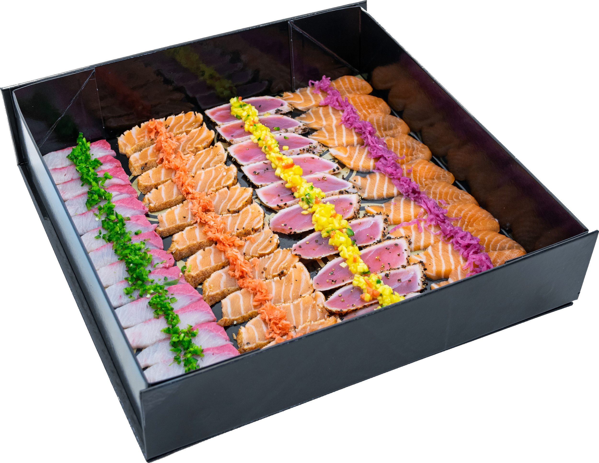 toasted tortilla, guacamole, salmon, tuna, yellow tail, masago